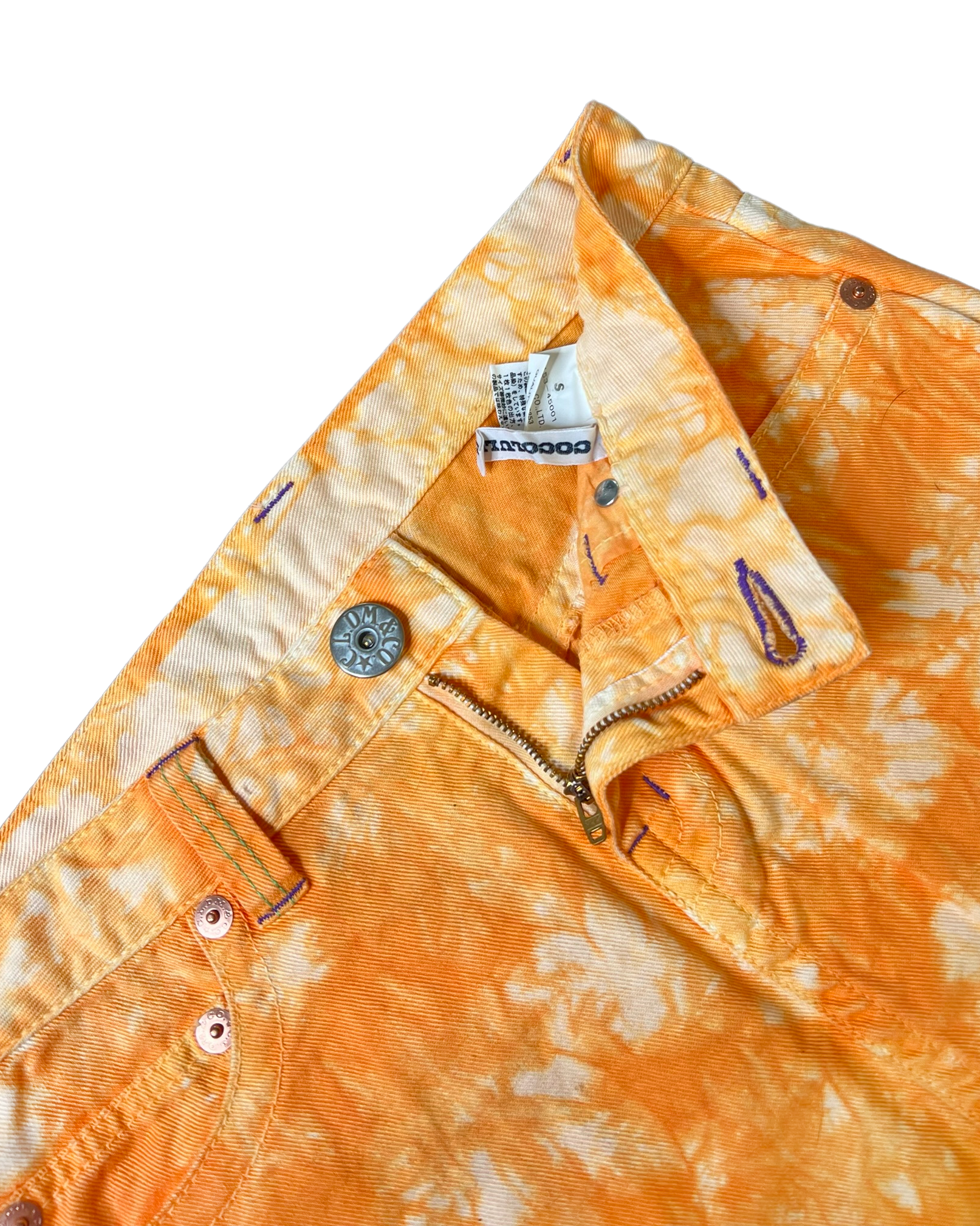 orange tie dye denim with lime green and purple contrast stitching